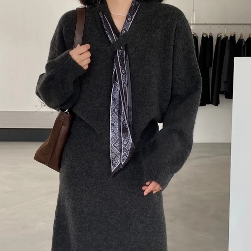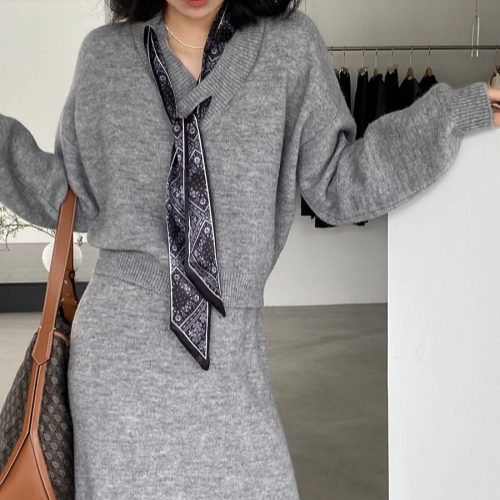【巨溫柔】針織衫套裝 韓系秋冬長裙套裝 軟糯氣質 送絲巾|套頭針織上衣|針織半身裙